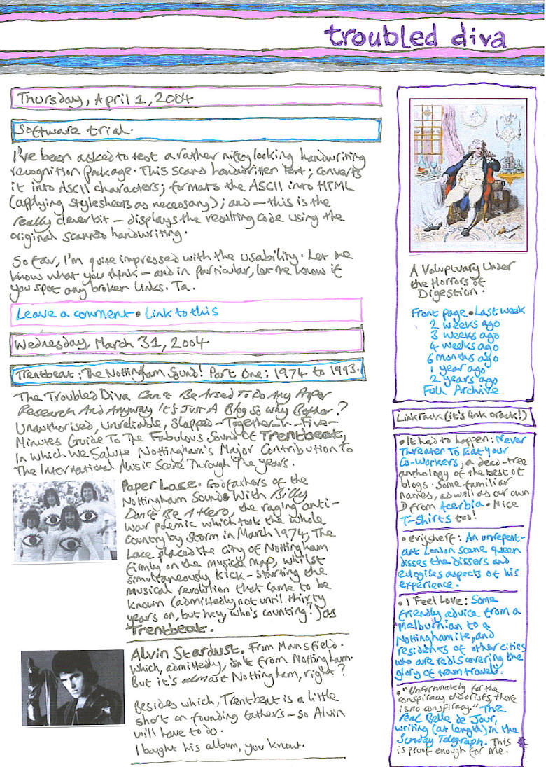 I’ve been asked to test a rather nifty looking handwriting recognition package. This scans handwritten text; converts it into ASCII characters; formats the ASCII into HTML (applying stylesheets as necessary); and – this is the really clever bit – displays the resulting code using the original scanned handwriting.