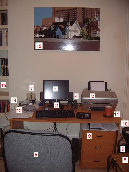 8. Sturdy beech-effect IKEA desk. (Yes, we do occasionally give house room to IKEA products. They’re particularly good on office stuff.) The drawers contain 95% crap which didn’t have a home elsewhere; I only ever open them to retrieve the digital camera, which lives in the middle drawer.