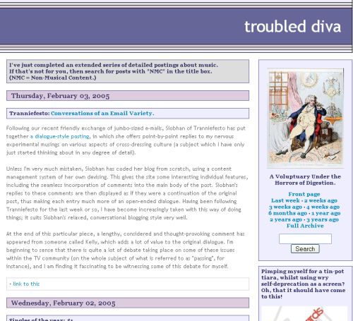 An sizeable excerpt from the blog is reproduced (sans permission, natch) in the pages of The Independent, as part of a two-page spread on “Citizens of the internet”. However, the piece wasn’t actually written by me. Instead, the dear confused old Indie lifted one of Vitriolica’s Consequences pieces, crediting the author of Troubled Diva as “Anonymous woman”. Oh well!