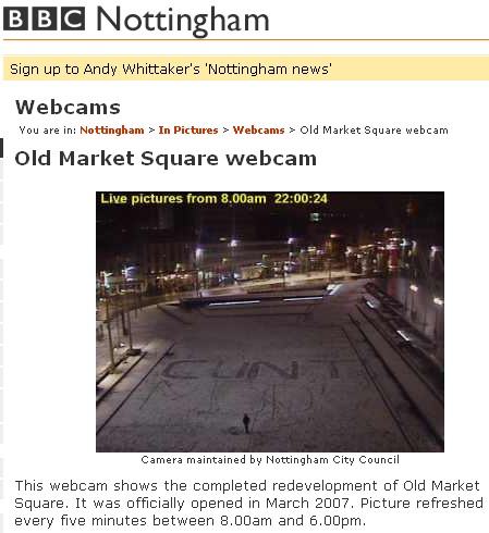 Ah, the magic of a fresh snowfall! For a couple of hours last night, BBC Nottingham’s live webcam feed from the Old Market Square displayed a very special image…