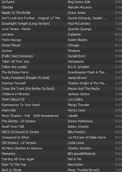 Click on the partial Spotify screengrab to activate the playlist. (There are a few more tracks above, and many more tracks below.)