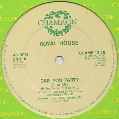 On this one, he calls himself Royal House. It’s basically a re-jigged version of the previous Royal House 12-inch, “Party People”. Both are based around the same tiny snatch of one of the very first big house tunes at The Garage: Marshall Jefferson’s “The House Music Anthem”, also known as “Move Your Body”. On “Party People”, this annoyed me; I just wanted the original riff to continue in full. But on the more forceful “Can You Party”, the elements snap into place.